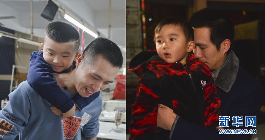 拼版照片:左圖為2021年1月26日,在福建省石獅市的金利萊斯服裝廠,聰聰和黃海龍?jiān)谝黄穑挥覉D為2018年2月2日凌晨,黃海龍即將登上返回四川的長(zhǎng)途車(chē),在上車(chē)前抱著不滿3歲的聰聰難舍難分。