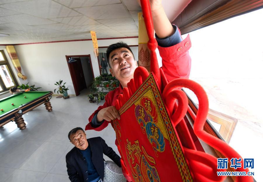 2月11日除夕當(dāng)天,王濤(右)在為脫貧戶劉玉強(qiáng)家掛中國結(jié)。