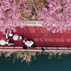 早春時(shí)節(jié),貴州省黔東南苗族侗族自治州錦屏縣三江鎮(zhèn)濱江步道櫻花盛開,吸引游人前來踏春賞花。