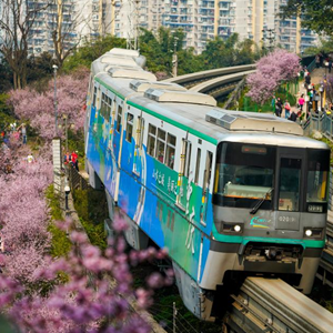 初春時節(jié),重慶氣溫逐漸回暖,暖陽里的山城春意盎然。在重慶軌道交通2號線佛圖關段,山城步道上的梅花簇簇綻放,單軌列車穿越花海,組成一幅賞心悅目的獨特城市景觀。