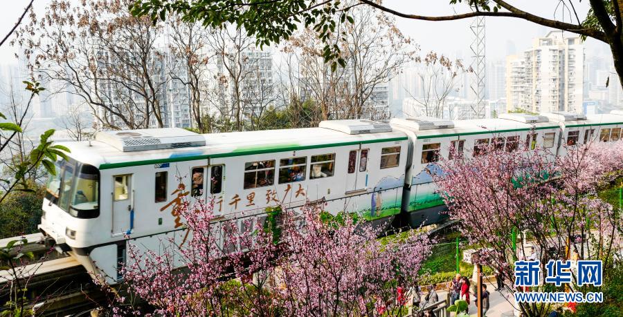 初春時節(jié),重慶氣溫逐漸回暖,暖陽里的山城春意盎然。在重慶軌道交通2號線佛圖關(guān)段,山城步道上的梅花簇簇綻放,單軌列車穿越花海,組成一幅賞心悅目的獨特城市景觀。
