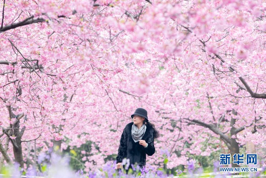 2月27日,游客在武漢東湖櫻花園觀賞櫻花。