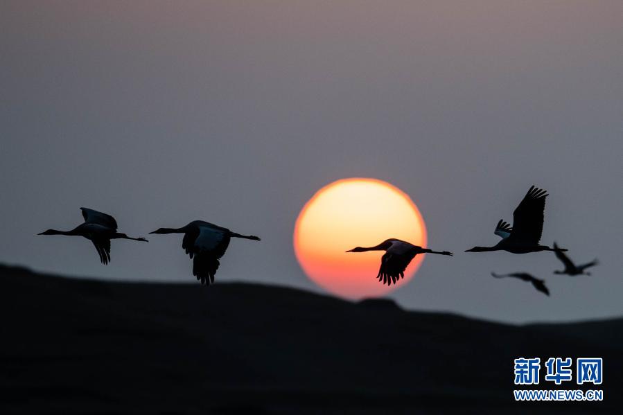 日出時(shí)分,黑頸鶴在大山包黑頸鶴國(guó)家級(jí)自然保護(hù)區(qū)飛翔(2月27日攝)。