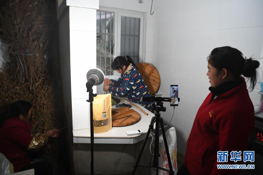 張志菊(右)在直播村民制作蒿子粑粑的過程(2月26日攝)。