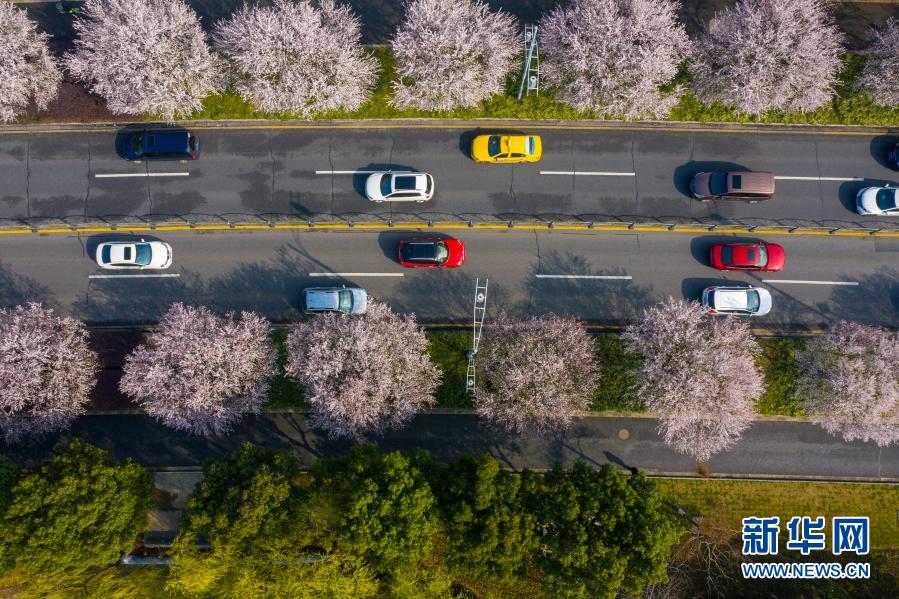 3月2日,汽車行駛在鮮花盛開的江蘇省昆山市馬鞍山路上(無人機(jī)照片)。春回大地,各地繁花盛開,春意盎然、生機(jī)勃勃。