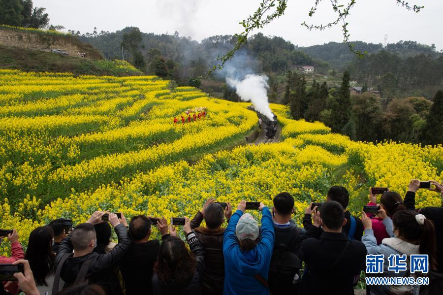 3月2日,一列嘉陽(yáng)小火車經(jīng)過(guò)段家灣蜜蜂巖的油菜花海,吸引眾多游客拍照。