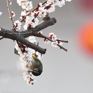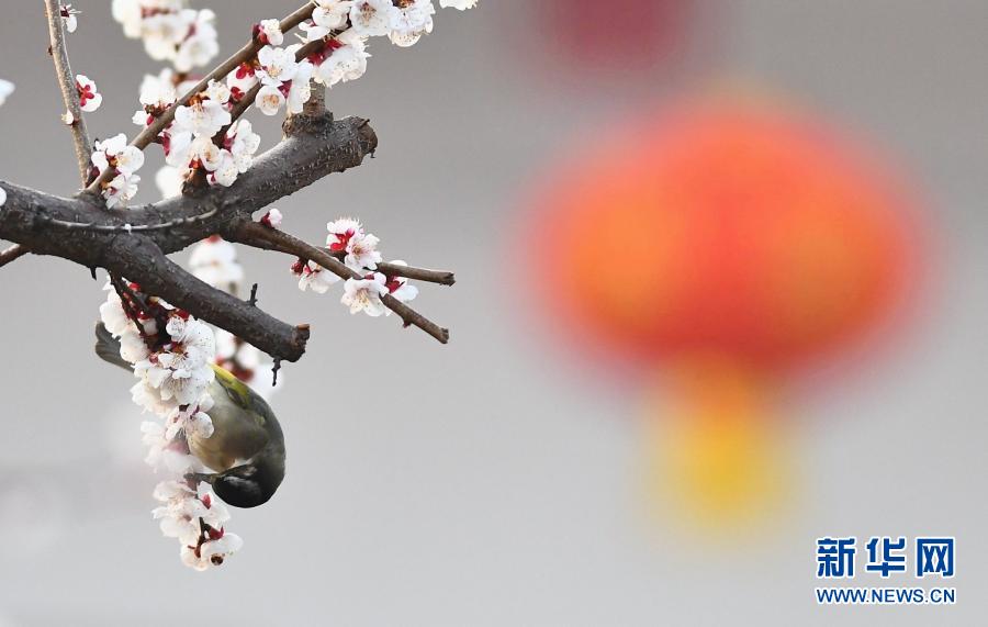 3月8日,小鳥(niǎo)在山東省滕州市公園花枝上覓食。