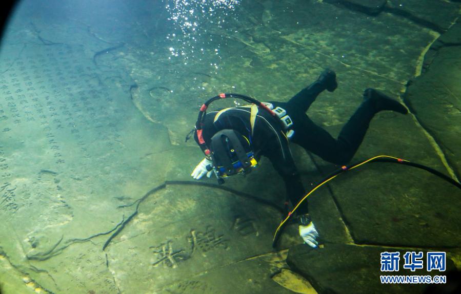 3月15日,在長江水下40多米的白鶴梁題刻無壓容器罩內(nèi),潛水員在進(jìn)行清理作業(yè)。新華社記者 劉潺 攝