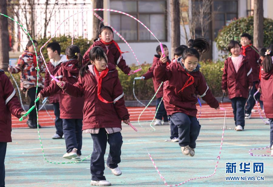 騎路小學(xué)的學(xué)生們在參加早操跳繩鍛煉(3月10日攝)。新華社記者 楊磊 攝