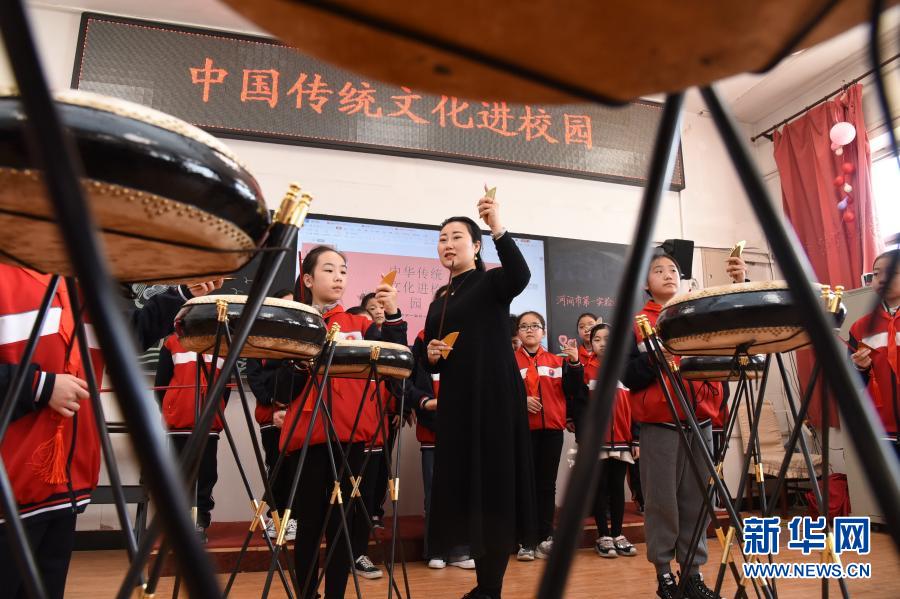 3月17日,西河大鼓藝人在河間市第一實驗小學指導學生練習西河大鼓。