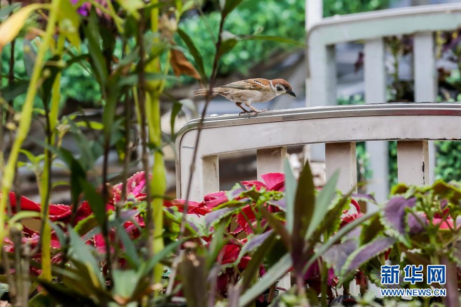 3月18日,在位于馬尼拉的菲律賓大學(xué)附屬菲律賓總醫(yī)院,一只麻雀站在“低語的花床”藝術(shù)裝置上。