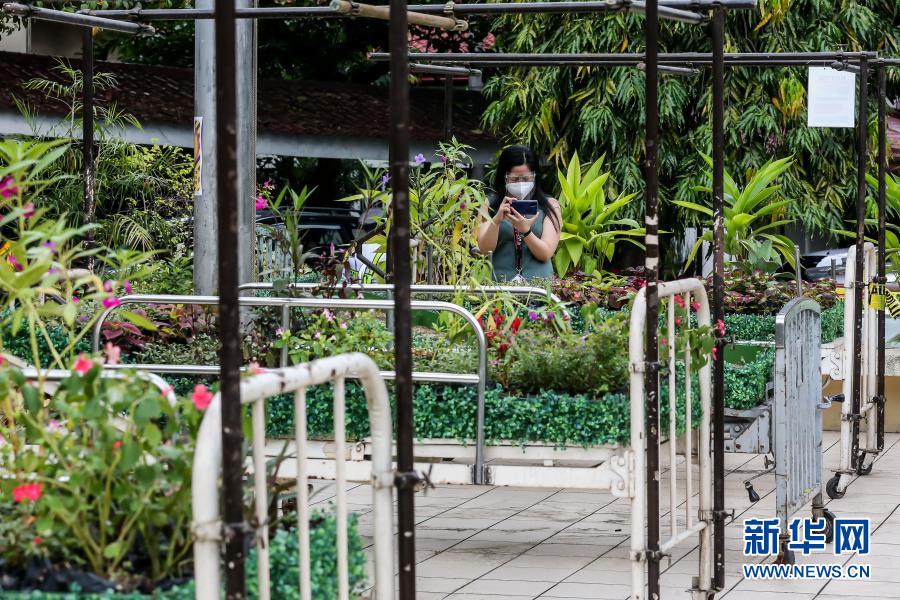 3月18日,在位于馬尼拉的菲律賓大學附屬菲律賓總醫(yī)院,一名女子為“低語的花床”藝術裝置拍照。