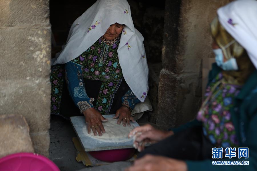 3月17日,70歲的卡茲蘭·阿布·卡巴什(左)和78歲的拉比亞·阿布·卡巴什在約旦河西岸城市希伯倫附近的一個(gè)村莊制作“塔本”烤餅。