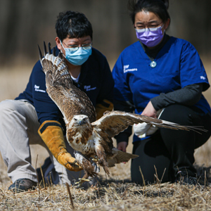 當(dāng)日,北京猛禽救助中心在北京市延慶區(qū)野鴨湖濕地公園附近空地放飛了兩只康復(fù)治療后的大鵟。此次放飛的兩只大鵟在去年12月分別被市民發(fā)現(xiàn),其中一只因饑餓、虛弱原因被救治,另一只因闖入市民鴿舍覓食被發(fā)現(xiàn)且身體有創(chuàng)傷被救治。經(jīng)過三個(gè)月的治療,兩只大鵟均已康復(fù)并達(dá)到了放歸野外標(biāo)準(zhǔn)。北京猛禽救助中心的猛禽康復(fù)師為兩只大鵟佩戴了GPS追蹤器,以監(jiān)測(cè)它們被放歸大自然后的情況。