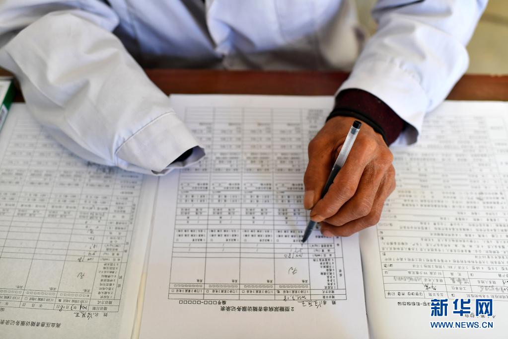 在山西省石樓縣鐵頭村衛(wèi)生室,張尚保在填寫糖尿病患者隨訪服務(wù)記錄表(3月24日攝)。新華社記者 詹彥 攝