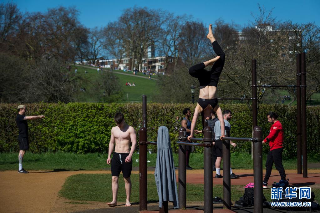 3月29日,人們在英國倫敦報(bào)春花山的戶外健身區(qū)域鍛煉。