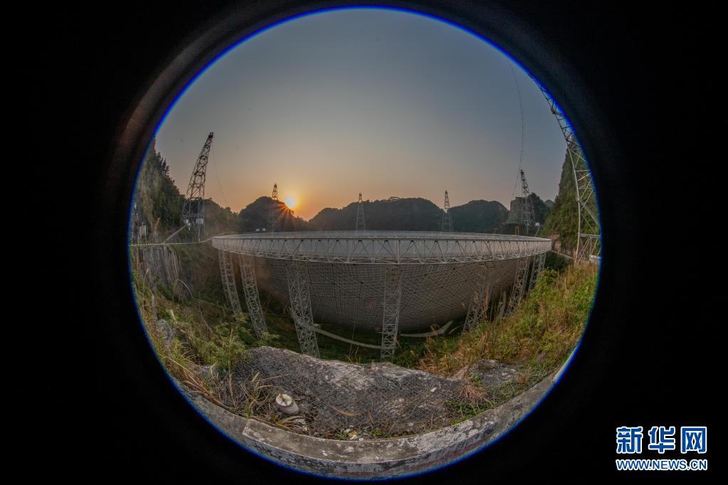 3月29日拍攝的晚霞中的“中國(guó)天眼”全景(維護(hù)保養(yǎng)期間魚眼鏡頭拍攝)。