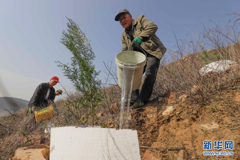 3月31日,造林隊(duì)員在河北省遵化市石門鎮(zhèn)金星山給新栽的樹苗澆水。