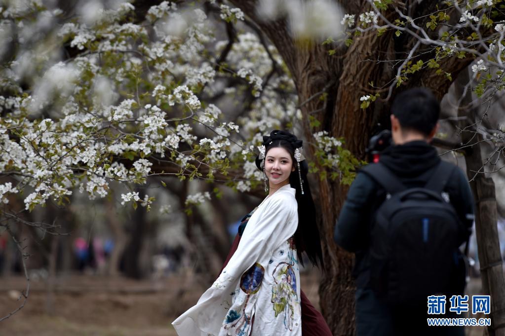 4月3日,游客在中衛(wèi)市南長(zhǎng)灘村梨花園內(nèi)拍照留影。