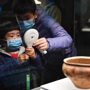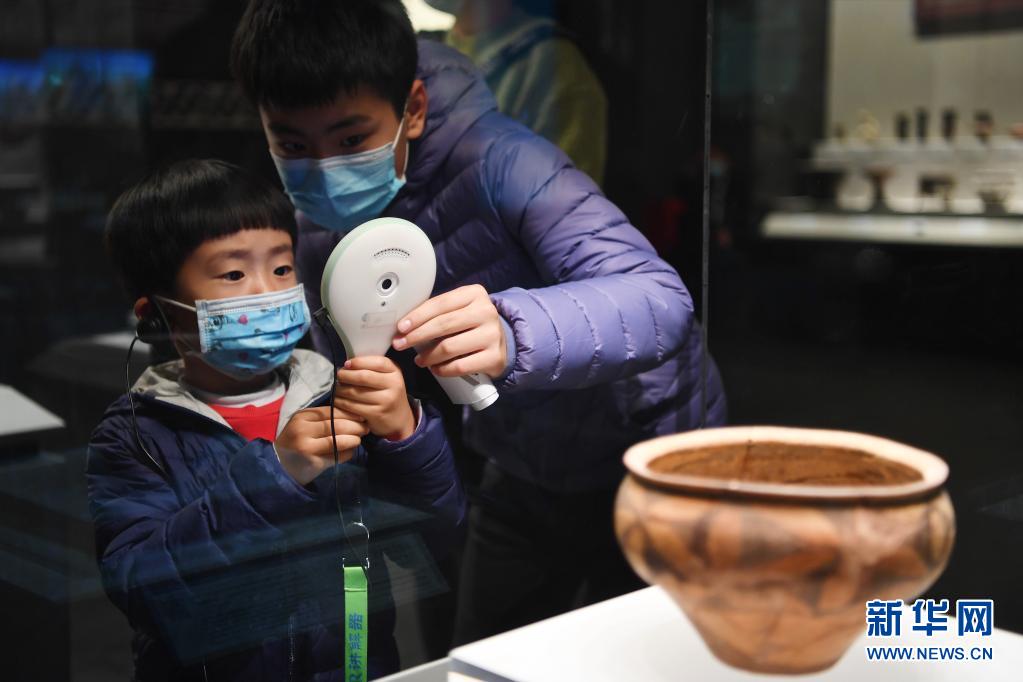 4月5日,小朋友用AR講解器觀看河南博物院展出的“花瓣紋彩陶缽”。