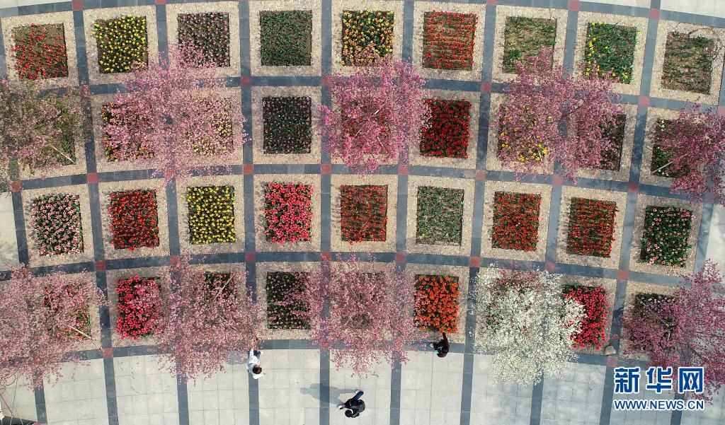 4月8日拍攝的石家莊市植物園內(nèi)的郁金香展(無人機(jī)照片)。