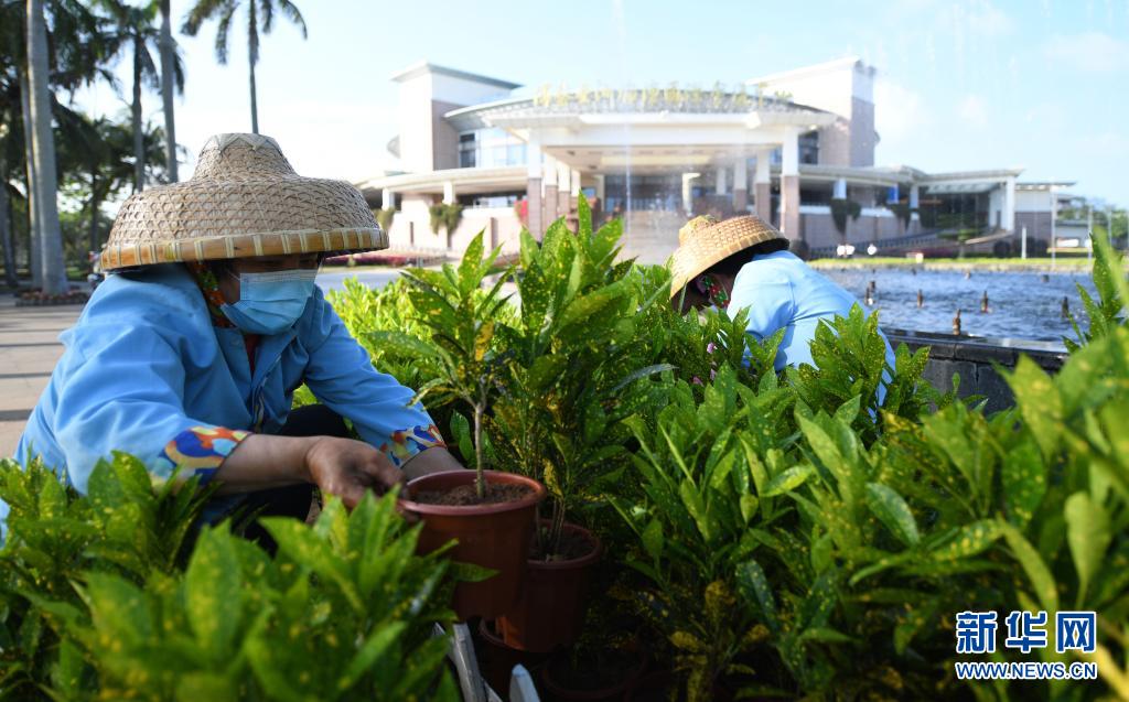 4月10日,工人在布置主會(huì)場(chǎng)室外綠植。