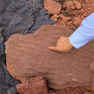 這是波痕沉積結(jié)構(gòu)化石和晚白堊世恐龍同時(shí)期的底棲生物潛穴化石(4月6日攝)。