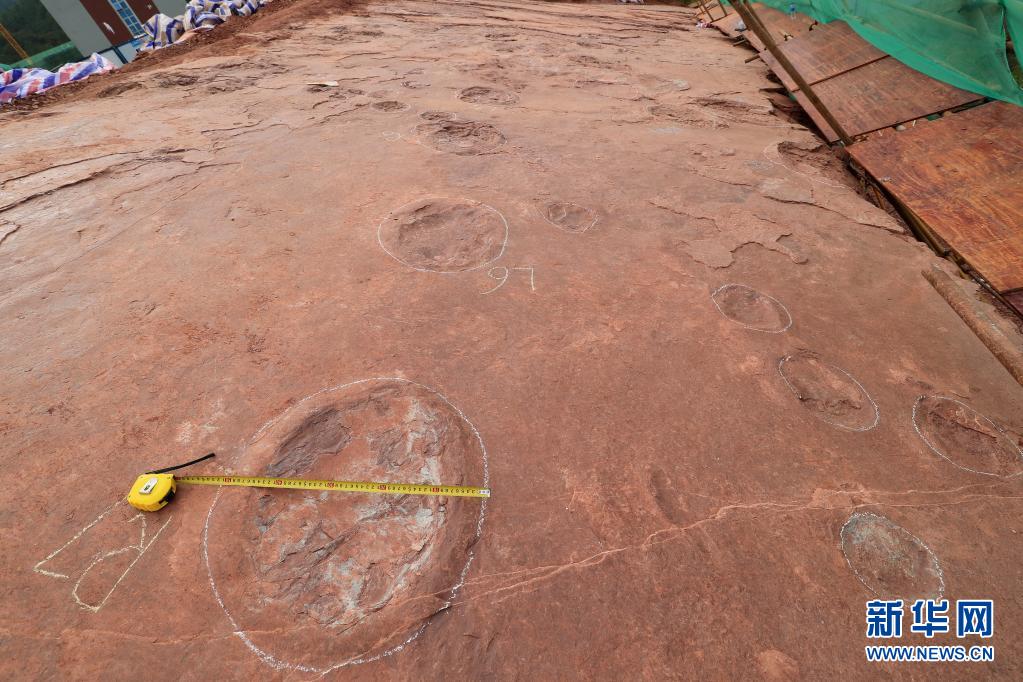 這是新發(fā)現(xiàn)的大型蜥腳類恐龍足跡化石(4月6日攝)。