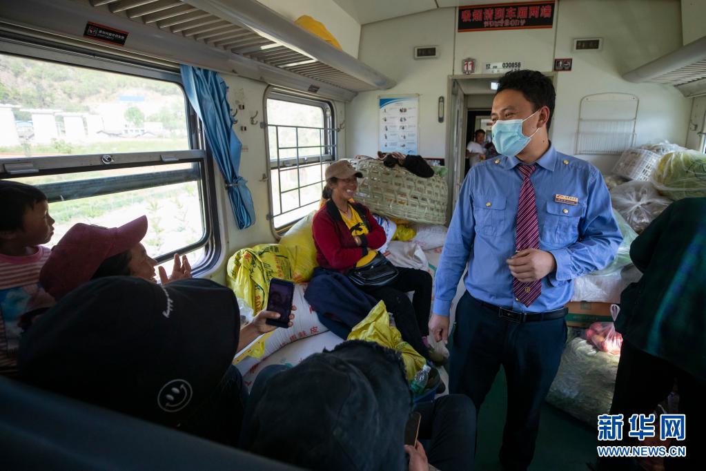 中國鐵路成都局集團(tuán)公司成都客運(yùn)段5634次列車員吉木阿且(右一)在車廂里與彝族乘客交流(4月12日攝)。5633/5634次列車配備了6名彝族列車員,以更好地為當(dāng)?shù)匾妥灏傩辗?wù)。新華社記者 沈伯韓 攝