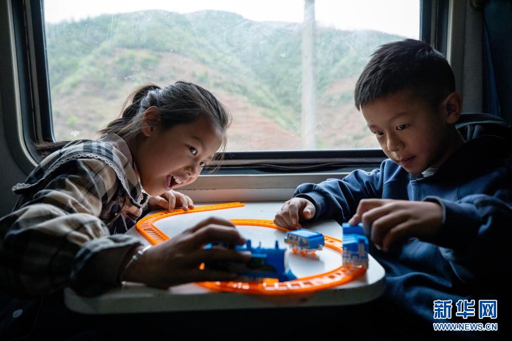 在乘坐5633次列車從家返校途中,喜德縣城關小學三年級學生阿爾伍支(左)和弟弟羅澤元在玩火車玩具(4月11日攝)。姐弟倆幾乎每個星期都坐這趟火車往返于家和學校之間。新華社記者 沈伯韓 攝