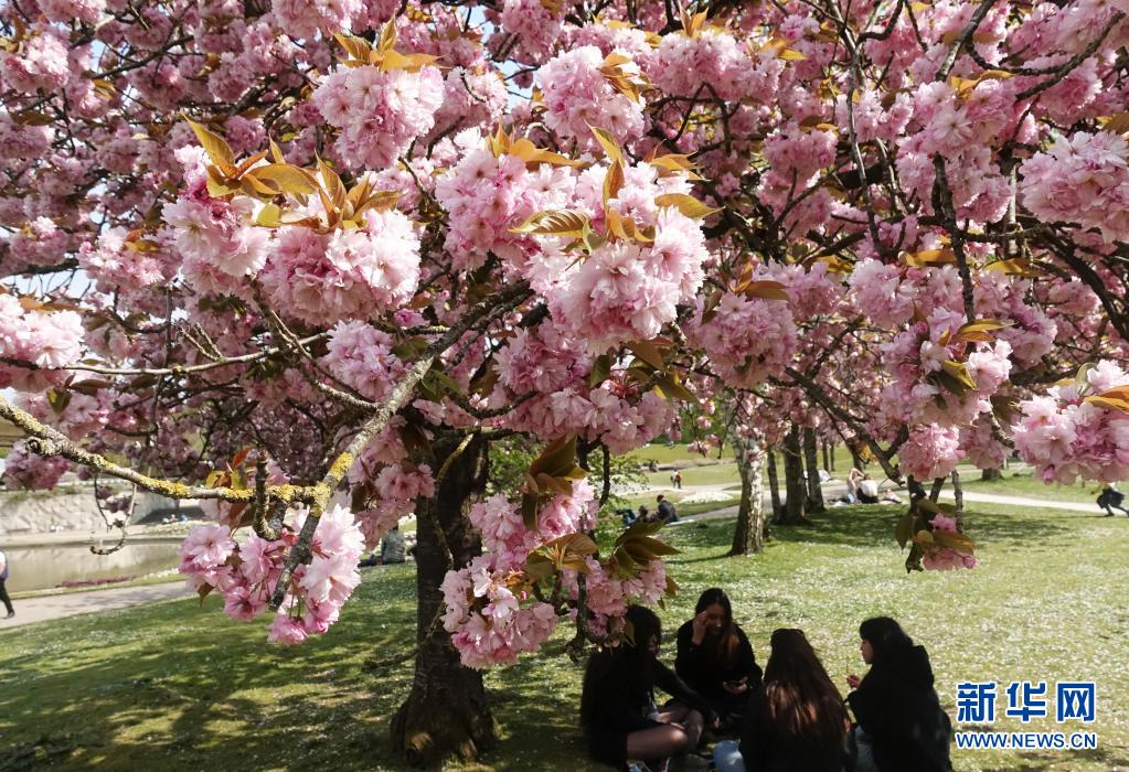 4月21日,人們?cè)诜▏?guó)巴黎一處公園的櫻花樹(shù)下休閑。