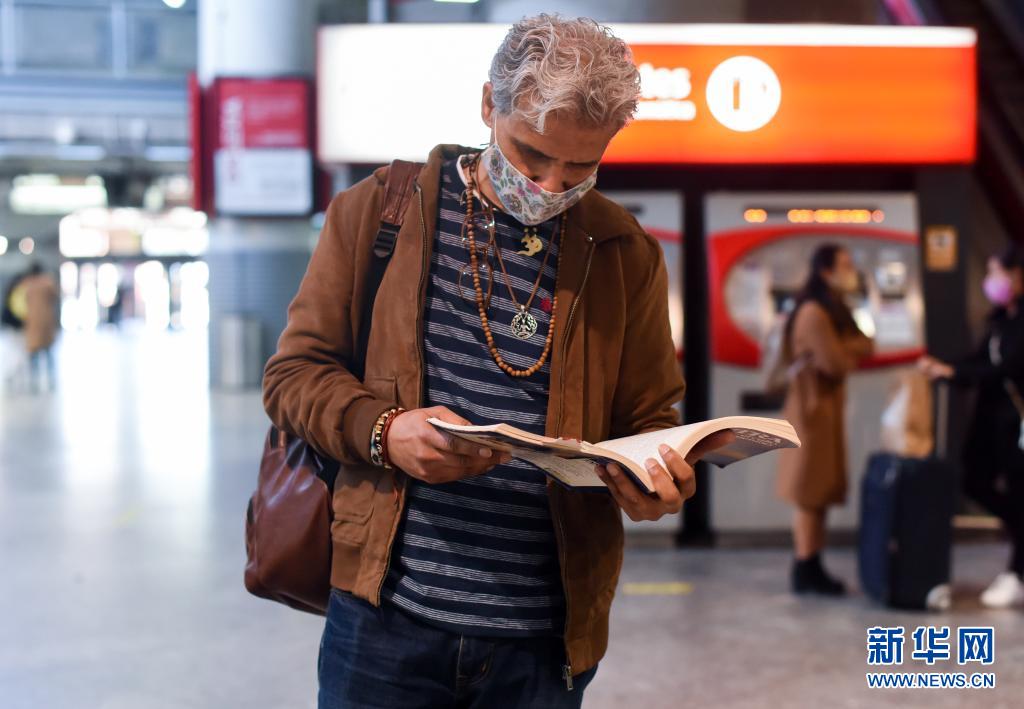 4月17日,一名男子在西班牙馬德里一處車站內(nèi)讀書。
