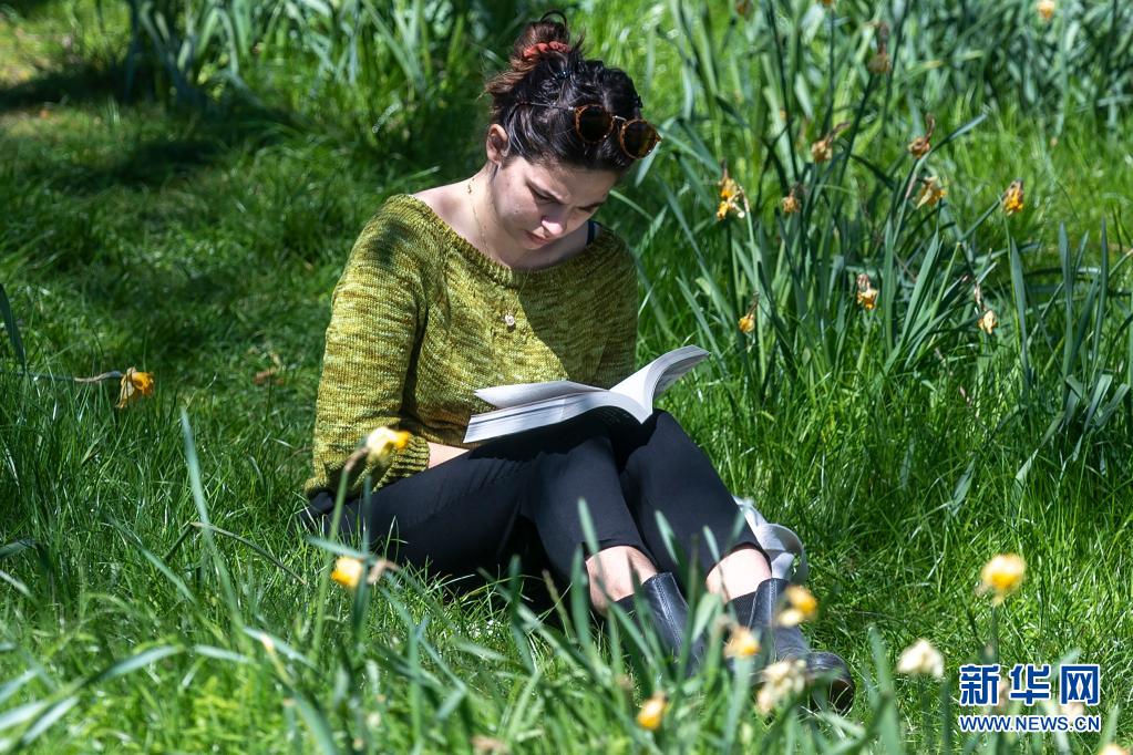 4月17日,一名女子在英國(guó)倫敦一個(gè)公園的花叢中讀書。