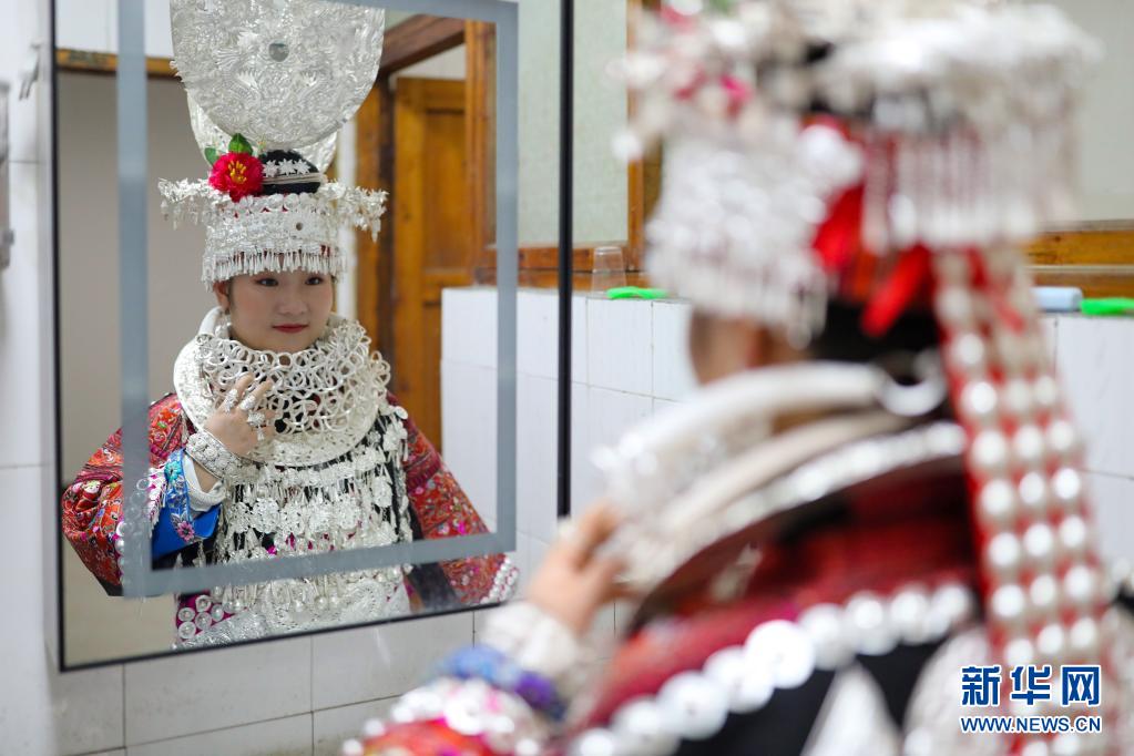 4月25日,穿戴好苗族盛裝的張佳麗在照鏡子。