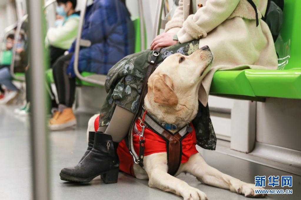 導(dǎo)盲犬“Bingo”陪伴李靜乘坐地鐵(3月27日攝)?! ⌒氯A社發(fā) (張夢 攝)