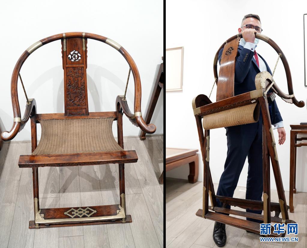 這是4月28日在香港展出的黃花梨麒麟紋圈背交椅(拼版照片)。