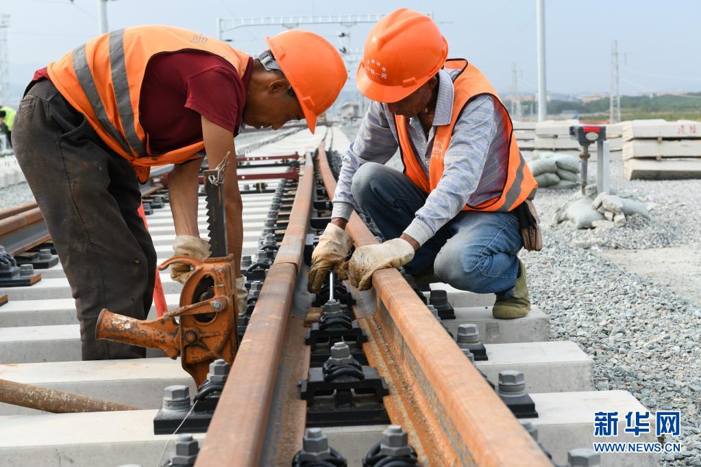 5月1日,工人在中老鐵路國(guó)內(nèi)段云南西雙版納火車站工地進(jìn)行鋪軌作業(yè)。