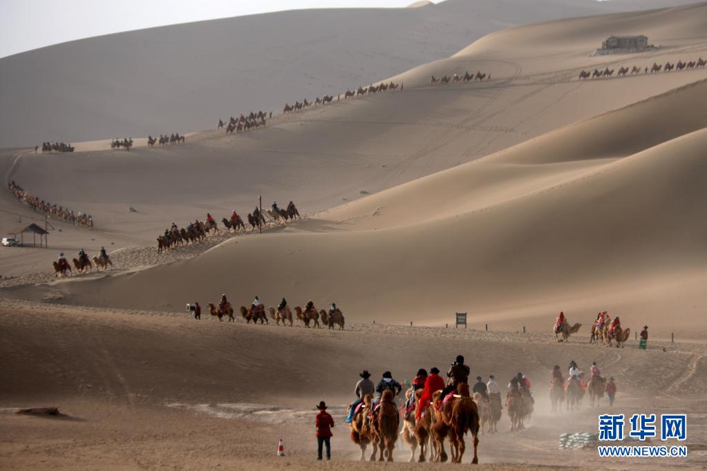 5月1日,游客在甘肅省敦煌市鳴沙山月牙泉景區(qū)游覽。
