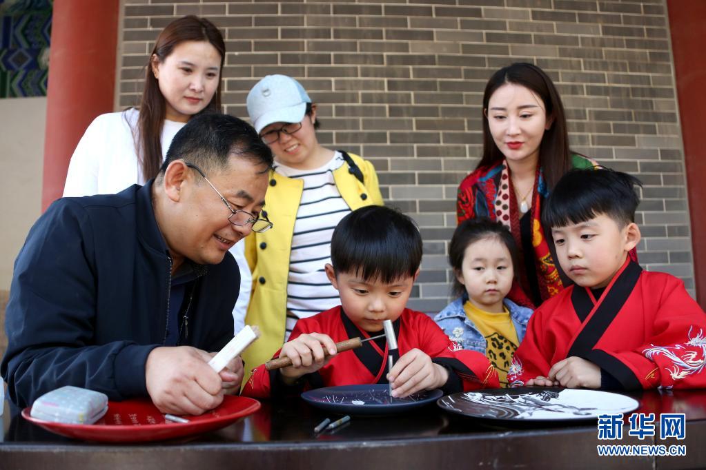 5月1日,在山東省棗莊市孟莊鎮(zhèn)境內的龜山風景區(qū),民間藝人胡安同(前左一)向小朋友傳授非遺刻瓷技藝。