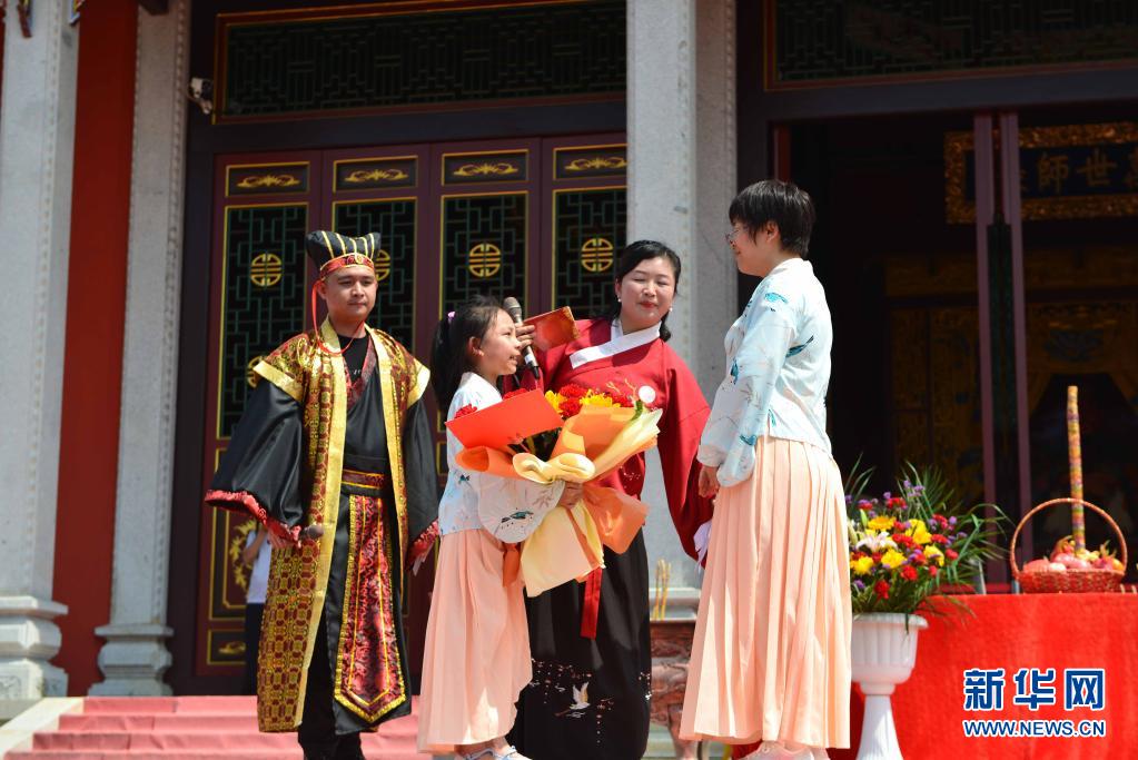 5月9日,在廣西賀州市八步區(qū)賀街鎮(zhèn)的賀州文廟國(guó)學(xué)教育基地,一名小女孩在母親節(jié)“孝行天下”活動(dòng)中向母親獻(xiàn)花。