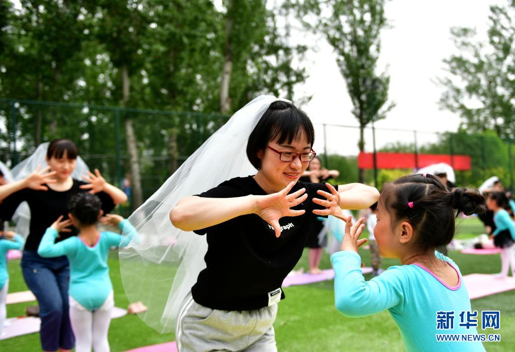 5月9日,在河北省邯鄲市館陶縣奧林匹克公園舉行的母親節(jié)主題活動中,媽媽與孩子一起做親子游戲。