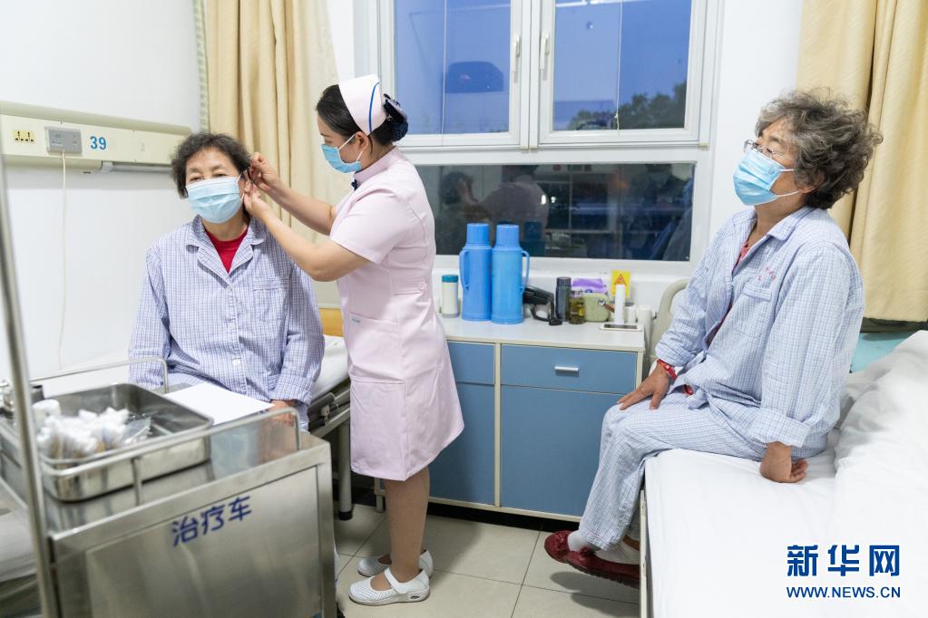 5月10日,在北京按摩醫(yī)院,病房護(hù)士為住院病人貼耳豆。