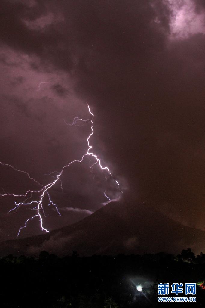 這是5月13日在印度尼西亞北蘇門(mén)答臘省拍攝的錫納朋火山上空的閃電(長(zhǎng)時(shí)間曝光照片)。
