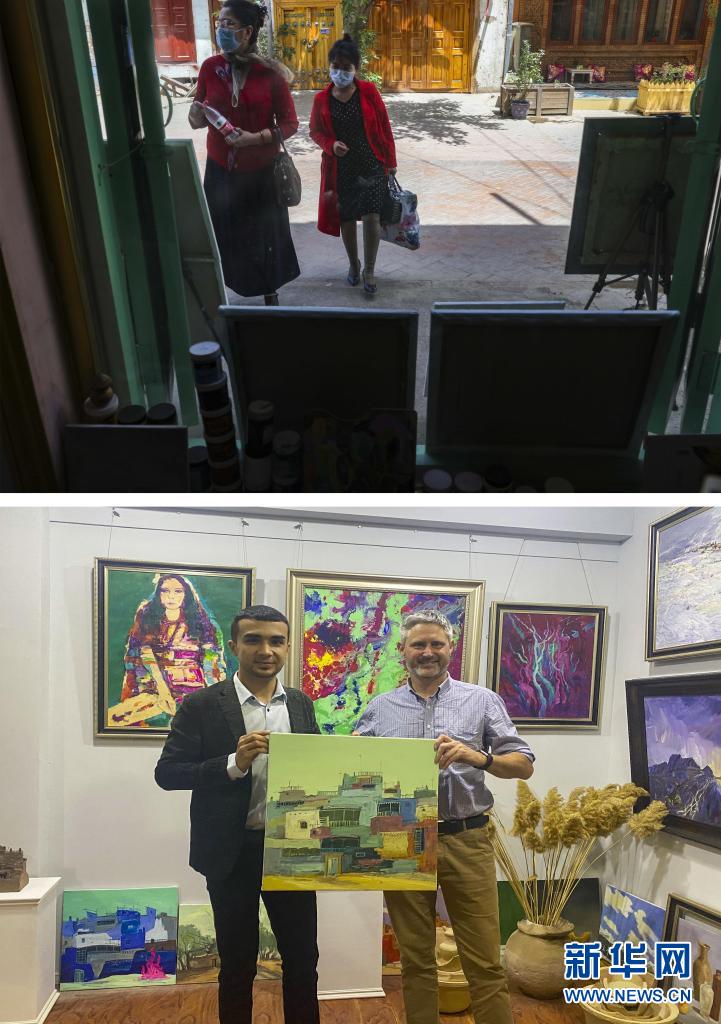 拼版照片:上圖為兩名行人在麥麥提吐?tīng)栠d江的工作室外觀看畫(huà)作(5月8日,新華社記者胡虎虎攝);下圖為“五一”期間,一名來(lái)自烏克蘭的游客(右)購(gòu)買畫(huà)作后與麥麥提吐?tīng)栠d江合影(受訪者供圖)。新華社發(fā)