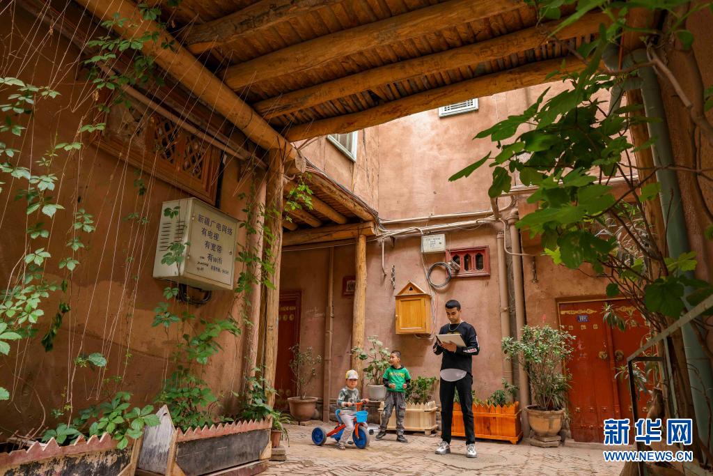 麥麥提吐爾遜江·麥麥提依明在新疆喀什古城景區(qū)的小巷內(nèi)進(jìn)行速寫創(chuàng)作,兩名小朋友好奇上前圍觀(5月6日攝)。新華社記者 胡虎虎 攝