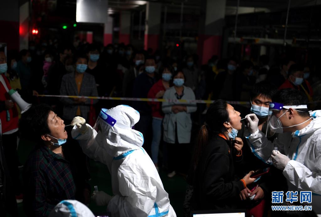 5月16日晚,在肥西縣上派鎮(zhèn)一小區(qū),工作人員為居民進(jìn)行核酸采樣。