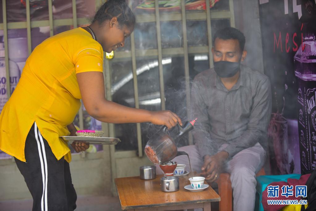 5月14日,一名女商販(左)在埃塞俄比亞亞的斯亞貝巴街頭的咖啡攤為顧客倒咖啡。