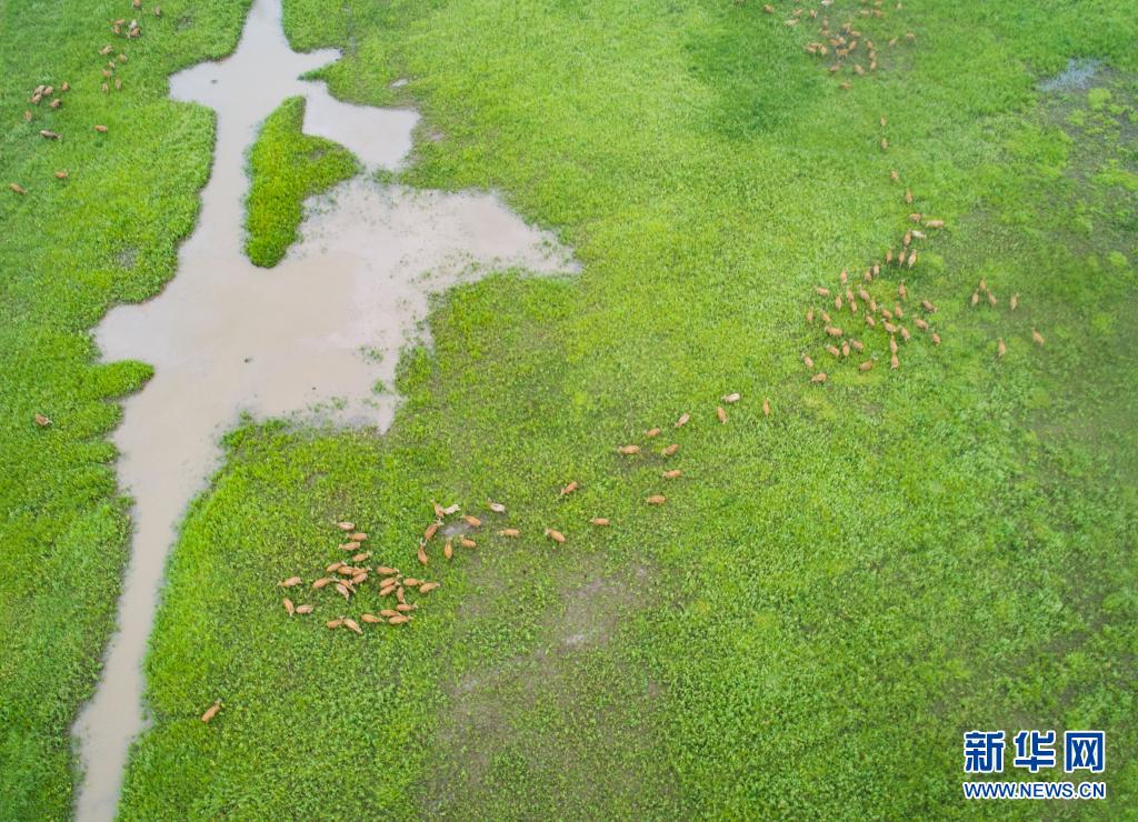 5月17日,一群麋鹿在石首麋鹿國(guó)家級(jí)自然保護(hù)區(qū)內(nèi)活動(dòng)(無人機(jī)照片)。新華社記者 肖藝九 攝