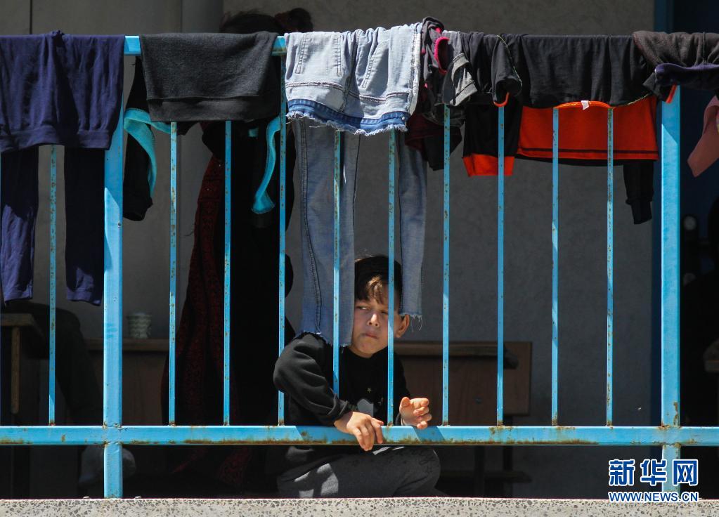 5月19日,受空襲影響而逃離家園的5歲巴勒斯坦兒童艾哈邁德·蘇丹在加沙城的一所學(xué)校臨時(shí)棲身。