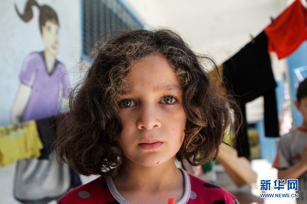 5月19日,受空襲影響而逃離家園的5歲巴勒斯坦兒童薩馬·蘇丹在加沙城的一所學(xué)校臨時棲身。